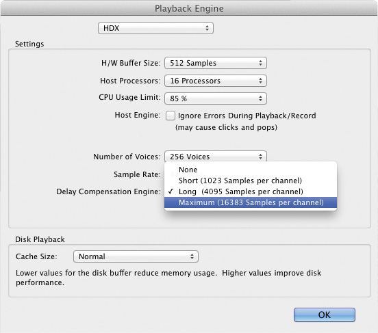 Pro Tools 10的一個(gè)新功能就是支持更大時(shí)間的延遲緩沖。以前Pro Tools只有長(zhǎng)和短兩項(xiàng)可選,現(xiàn)在則有了新的“最長(zhǎng)”這么一項(xiàng),如圖5。意味著以前在44.1或48kHz下可使用16383采樣數(shù)的延遲,88.2或96kHz下是32767采樣數(shù)延遲,176.4或192kHz則有65534采樣數(shù)延遲。所有的Pro Tools用戶都可從中得到好處,除了那些使用Pro Tools HD老硬件的哥們兒們。Avid聲稱由于TDM硬件的一些限制,使得老HD卡用戶在大緩沖下要耗費(fèi)更多的內(nèi)存了(明顯逼你升級(jí)HDX嘛)。