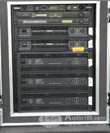 一臺QSC的RAVE522通過CobraNet數(shù)字網(wǎng)絡(luò)(使用Cat-6類線),將主控調(diào)音臺與機柜里的QSC PL3系列功放(PL6.0/PL380/PL340)連接在一起,最終驅(qū)動線陣和超低音揚聲器。