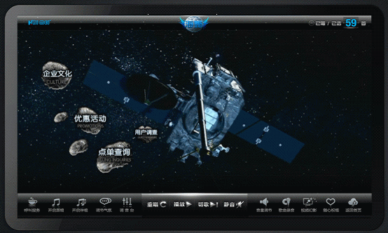 進入首頁,很清晰看到由K歌、酒吧、電影和營運服務四個模塊組成的V8【K探索】,這與小編見過的其它點歌系統(tǒng)有很大不同,其它系統(tǒng)看到的都是以K歌為主的各分類,而這個系統(tǒng)多了兩個主模塊酒吧和電影,不知道它們到底有哪里吸引我們的呢?動態(tài)的三維立體星球視頻詮釋了該版本涵義:探索KTV娛樂行業(yè)、探索科技創(chuàng)新、探索太空星際,顯示出了海媚人的創(chuàng)新精神,下面簡單介紹下使用過程: