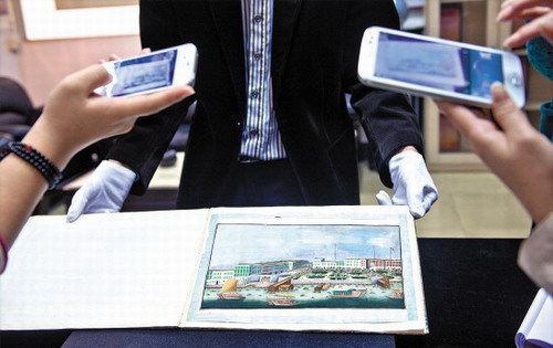 迪士普企業(yè)董事長王恒展示他準(zhǔn)備捐贈的通草畫藏品
