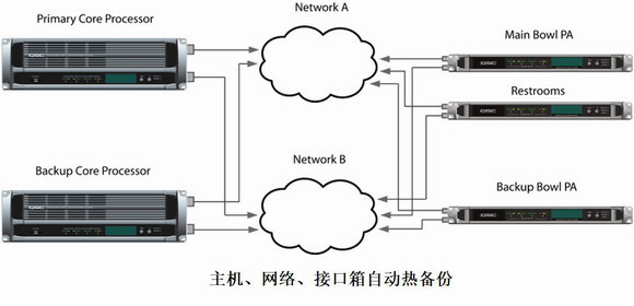傳統(tǒng)的模擬系統(tǒng)通常采用系統(tǒng)冷備份方式,當系統(tǒng)出現故障的時候,需要重新連接系統(tǒng),容易出現系統(tǒng)連接錯誤、導致系統(tǒng)不能馬上工作。而Q-SYS系統(tǒng)具有熱備份機制,可以實現實時的系統(tǒng)備份功能供用戶選擇。如圖所示: