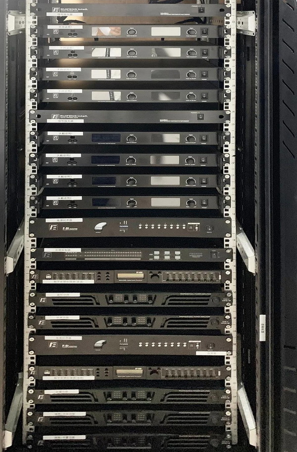 文體活動中心的報告廳選用了銳豐智能"RF"VK10線陣列揚聲器系統(tǒng),左右聲道的主擴聲為單10寸線陣列音箱VK10+VK10S(4+1組合),中置聲道的擴聲音箱采用了VK10(4只組合),主擴聲音箱采用了隱藏安裝方式,在滿足聽眾區(qū)有足夠高聲壓級和均勻度的同時,強指向覆蓋能有效避免了室內強反射的情況出現(xiàn),達到較高的語言清晰度。