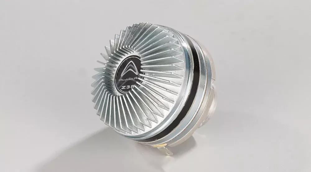 在要求高顏值的外觀的同時(shí),我們對(duì)產(chǎn)品品質(zhì)及性能的要求已經(jīng)到達(dá)了極致,該系列高音單元包括T鐵、磁鐵、華司、音膜、相位塞以及蓋體,蓋體包括開(kāi)拆卸連接的前蓋以及后蓋,相位塞、音膜、華司、磁鐵、T鐵依次設(shè)置在前蓋和后蓋之間,T鐵設(shè)置在后蓋內(nèi)側(cè),磁鐵、華司依次套設(shè)在T鐵上,音膜設(shè)置在華司上,后蓋上設(shè)置有多個(gè)散熱板,多個(gè)散熱板排列呈環(huán)形發(fā)散狀分布。本實(shí)用新型提供的高音揚(yáng)聲器與現(xiàn)有技術(shù)相比,本實(shí)用新型在后蓋的端部設(shè)置多個(gè)散熱板,有助于加快后蓋的散熱速度,提高后蓋的散熱速度,以防音膜、相位塞在長(zhǎng)時(shí)間工作時(shí)發(fā)生過(guò)熱的狀況,延長(zhǎng)了高音揚(yáng)聲器的使用壽命,并榮獲了實(shí)用新型專利,專利號(hào)201821875687.3。