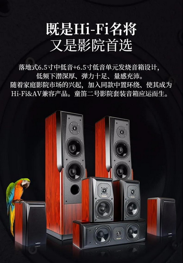 秉承打造“高品質(zhì)”、“高品位”、“高技術(shù)”的“三高”第一國(guó)產(chǎn)民族品牌的發(fā)展理念,為追求更宏大的發(fā)展目標(biāo),1996年,天逸音響專為高品位人群傾力打造的HI-FI音箱,童笛品牌之——“童笛”系列產(chǎn)品。該系列音箱開啟了天逸音響在海內(nèi)外中高端音響市場(chǎng)的漫漫征途,多年來暢銷全球數(shù)十個(gè)國(guó)家和地區(qū)。 童笛二號(hào)沿襲“童笛”系列的經(jīng)典設(shè)計(jì),是天逸發(fā)燒音箱的一大力作。第一代童笛二號(hào)早在1997年即上市銷售,最初以出口歐美為主,后期導(dǎo)入國(guó)內(nèi)銷售,產(chǎn)品發(fā)展至今,歷經(jīng)數(shù)次改進(jìn)升級(jí),已發(fā)展至第五代,其始終在堅(jiān)持追求高品質(zhì)、高音質(zhì)的嚴(yán)苛要求中得到不斷完善和升華, 是一款深受國(guó)內(nèi)外發(fā)燒友喜愛的經(jīng)典產(chǎn)品! 隨著國(guó)內(nèi)影院市場(chǎng)的崛起,童笛二號(hào)瞬間成為了一款極具AV明星潛質(zhì)的HI-FI音箱,作為一款具有6.5寸中低音+6.5寸超低音發(fā)燒單元的HI-FI落地音箱,人聲和樂器的表現(xiàn)自然不在話下,其低頻下潛深厚、彈力十足、量感充沛的HI-FI特性完全滿足觀影的要求,一時(shí)間眾多燒友強(qiáng)烈要求加入同款中置環(huán)繞,使其升級(jí)成HI-FI & AV全兼容產(chǎn)品的呼聲越來越高。