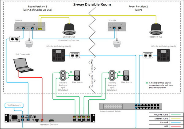 本系統(tǒng)設(shè)計(jì)模板展示了 Tesira TCM-1 波束跟蹤話筒如何在典型的小型可兩分割會議室安裝中使用。傳統(tǒng)中,這類會議室設(shè)計(jì)既保證會議室內(nèi)與會者能夠利用本地展示功能相互主持本地會議,又能通過電話(VoIP 或模擬 POTS)或者利用 PC 端軟編解碼器和遠(yuǎn)程與會者進(jìn)行電話會議。
