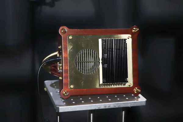 喀秋莎在外觀設(shè)計別出心裁 ,底座+喇叭花的造型有點像上個世紀的留聲機 ,黃銅色的金屬嵌入到紅木紋的木箱中 ,不顯絲毫違和 。復(fù)古的朋克風(fēng)格讓人眼前一亮。