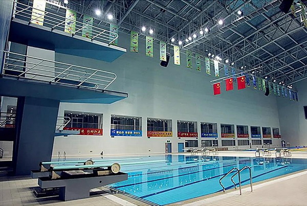 游泳跳水館一層為比賽大廳和訓(xùn)練大廳。二層為觀眾休息廳、商務(wù)包間。比賽大廳里共設(shè)兩個(gè)泳池。一個(gè)是10道標(biāo)準(zhǔn)比賽池,長(zhǎng)50米、寬25米、深3米;另一個(gè)是跳水池,長(zhǎng)21米、寬25米、深6米,跳水池還設(shè)置了符合奧運(yùn)比賽標(biāo)準(zhǔn)的3米跳板和10米跳臺(tái)。訓(xùn)練大廳里也設(shè)置了兩個(gè)泳池?拷肟谔幍氖8道訓(xùn)練池,水深在1.4至1.8米間,東側(cè)還有兒童直道池,最深1.1米。夏季,東側(cè)玻璃幕墻外的2個(gè)室外泳池也將對(duì)外開放,市民們的游泳活動(dòng)主要在這里進(jìn)行。大面積的玻璃幕墻,使該區(qū)域擁有極佳的采光效果,為到這里游泳的市民提供了通透、明亮的環(huán)境。