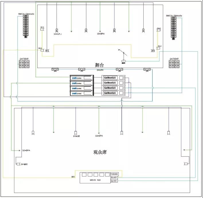 揚(yáng)聲器系統(tǒng)在舞臺(tái)兩側(cè)每邊各明裝吊掛Meyer Sound的9只Mica下接2只Melodie線陣列揚(yáng)聲器,Melodie在Mica下面作為近場(chǎng)補(bǔ)聲;超低揚(yáng)聲器選用700HP,布置在Mica正下方舞臺(tái)兩側(cè),每邊各6只。