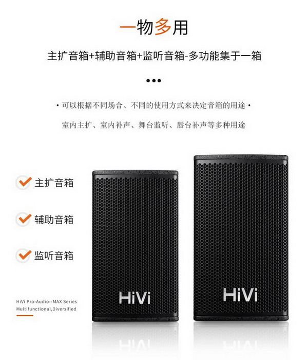 MAX系列專業(yè)音箱--玲瓏的體積設(shè)計以小博大,MAX1的高度僅為380mm,額定功率達(dá)到200W,峰值功率達(dá)到800W,最大聲壓級達(dá)到124dB;MAX2的高度為415mm,額定功率300W,峰值功率達(dá)到1200W,連續(xù)聲壓級達(dá)到126dB,整個系列具有大功率大聲壓的特點(diǎn),聲音干凈均勻,富有層次感。