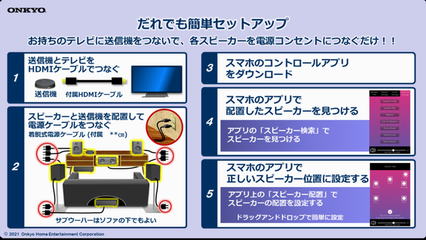 本產(chǎn)品采用了世界上60多家品牌采用的“WiSA”無線聲音傳輸技術(shù),揚聲器與主機不需要連接音頻線就可以同時發(fā)送8路高音質(zhì)聲音。各揚聲器只需放在您喜歡的地方,連著電源線,就可以享受驚訝和感動的“聲音”?梢愿鶕(jù)不同的觀看位置調(diào)整各個揚聲器的間隔和角度,享受您喜歡的布局。