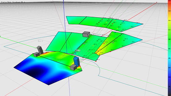 根據(jù)場地CAD圖紙,我們提前在EAW Resolution建模軟件中繪制了演奏廳的場地模型,并在場地中添加虛擬的NTX210L 模塊。通過調(diào)節(jié)全頻線陣列音箱間的夾角,得到陣列系統(tǒng)的聲場預(yù)測結(jié)果,最終確定了良好的適宜該廳堂的聲場覆蓋。