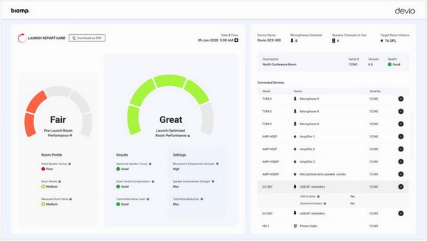 TesiraFORTÉ X具有Biamp Launch自動(dòng)調(diào)試功能,允許一鍵式房間硬件發(fā)現(xiàn)、配置和調(diào)試。在啟動(dòng)過程完成后,可通過網(wǎng)絡(luò)瀏覽器查看調(diào)試報(bào)告,報(bào)告內(nèi)容提供房間的聲學(xué)性能在調(diào)試之前與調(diào)試之后區(qū)別,生成Biamp硬件清單。生成的報(bào)告可以打印。