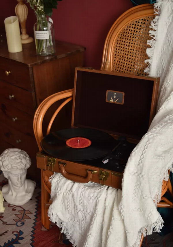 它是一臺(tái)入門(mén)級(jí)提箱式唱機(jī),濃郁的色調(diào)搭配黃銅色鉚釘、荷葉等金屬件,極具復(fù)古感。
