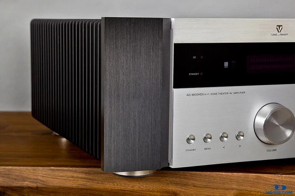 如果事先您對這臺AD9600HDII AV功放并不了解,第一眼的視覺印象肯定會把它歸入Hi-Fi功放的行列,因為它和天逸爆款Hi-Fi網(wǎng)紅功放AD-3/D實在是太像了:厚重的鋁合金拉絲面板,銀黑配色——這種被廣大天逸粉戲稱為“熊貓臉”Hi-Fi標簽。鋼中帶柔,配合機身兩側(cè)對稱的羽狀式巨型黑色鑄鋁散熱器,不威武都很難!