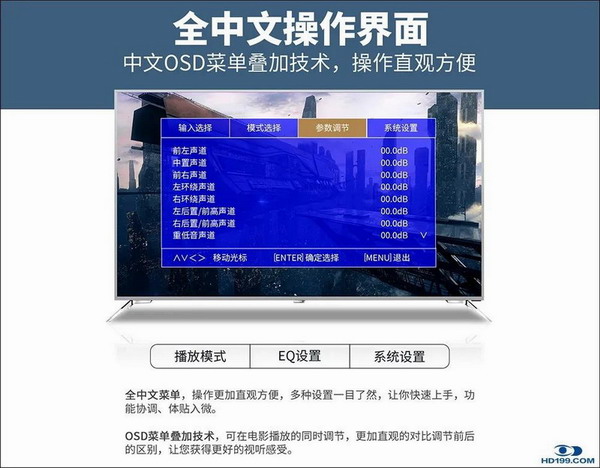 在改善各個聲道的聲學(xué)相應(yīng)的音質(zhì)音色方面,AD-9600HDII還在操作菜單中設(shè)置了強大的自動房間聲學(xué)設(shè)置: 包含房間EQ自動校正、自動EQ、影院模式、音樂模式、EQ平直,其中11段均衡器的中心頻率、增益EQ值等參數(shù)用戶都可以根據(jù)實際聽音環(huán)境進行修改。