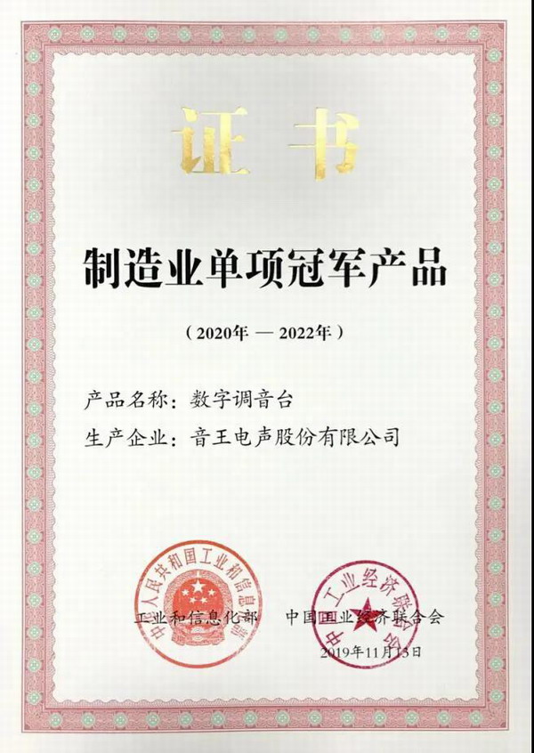 2012年,音王主導起草國家工業(yè)與信息化部行業(yè)標準SJ/T 11524《數(shù)字調音臺通用規(guī)范》,并于2015年經(jīng)工業(yè)與信息化部批準并發(fā)布實施,促進了國內外產(chǎn)品技術的規(guī)范與統(tǒng)一。2019年,音王數(shù)字調音臺憑借先進的生產(chǎn)技術、精良的生產(chǎn)工藝和位居全球前列的市場占有率榮獲“中國制造業(yè)單項冠軍產(chǎn)品”。
