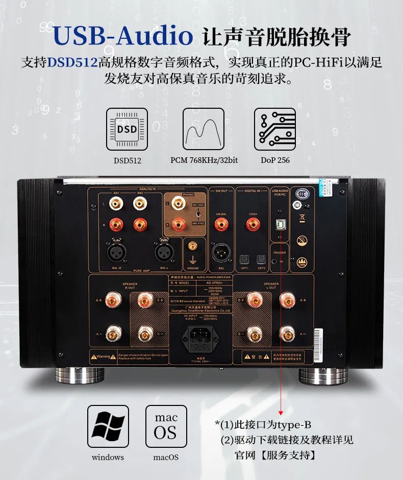 AD-2PRO+背板增加了USB-Audio接口,搭配頂級(jí)芯片CT7601PR,使本機(jī)支持DSD 512并向下兼容的數(shù)字音頻格式,以及768KHz/32bit的超高采樣率。此外,AD-2PRO+的功率也有原先的每聲道200W(8Ω)穩(wěn)定提升為每聲道240W(8Ω)。