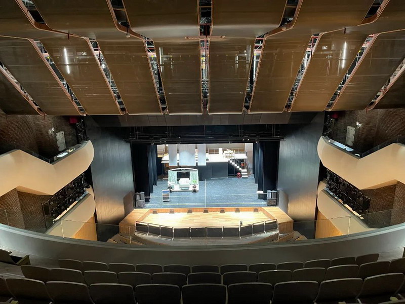 觀眾后區(qū)的擴聲設計上,由于城市舞臺劇場為有三層觀眾區(qū)的開放式階梯結構,樓層之間的觀眾區(qū)由于樓層高度和墻體遮擋,聲音在這些區(qū)域會形成所謂的聲音“盲區(qū)”或聲音的延遲,設計團隊結合布局特點,量身設計了一套系統(tǒng)安裝方案,在每一層觀眾區(qū)增加了2只10S作為環(huán)繞聲設備,以增強沉浸聲效果。在B1層與1F層形成的聲音“盲區(qū)”安裝2只44S作為補聲,在1F層增加了5只44S作為延時補聲,以保證聲音到達觀眾后區(qū)時與舞臺聲音同步一致。