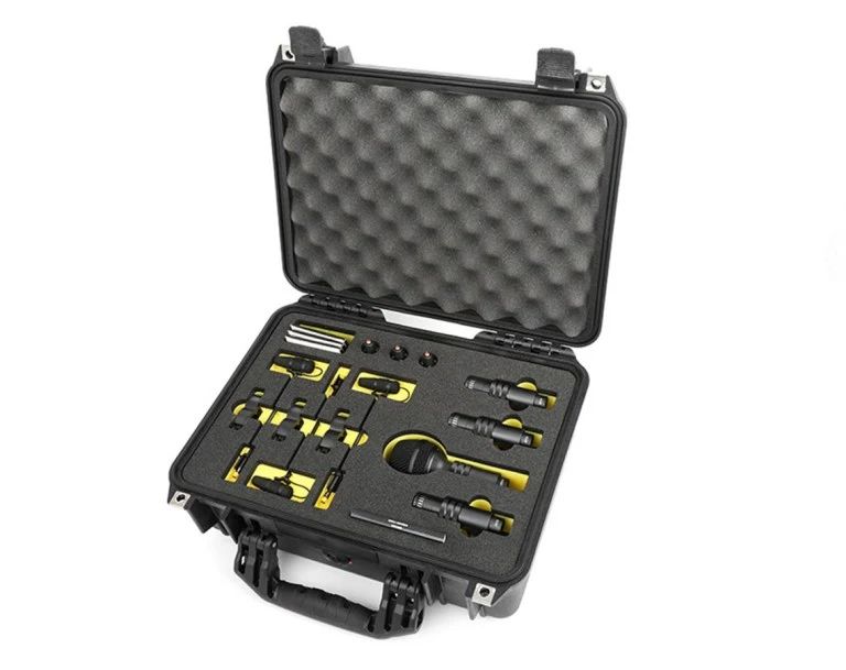 DDK4000 套裝配有一個(gè)保護(hù)性良好的盒子,泡沫中有凹槽,可以安全地固定話筒。話筒套裝的設(shè)計(jì)使其可以隨身攜帶,從而節(jié)省了安裝和拆卸時(shí)的寶貴時(shí)間。盒子里還包含幾個(gè)必備配件。三根連接到 4099 話筒的Microdot 線纜,隨附的 MicroDot 到 XLR 適配器和三個(gè)用于將 4099 固定在鼓圈上的柔性橡膠話筒夾。
